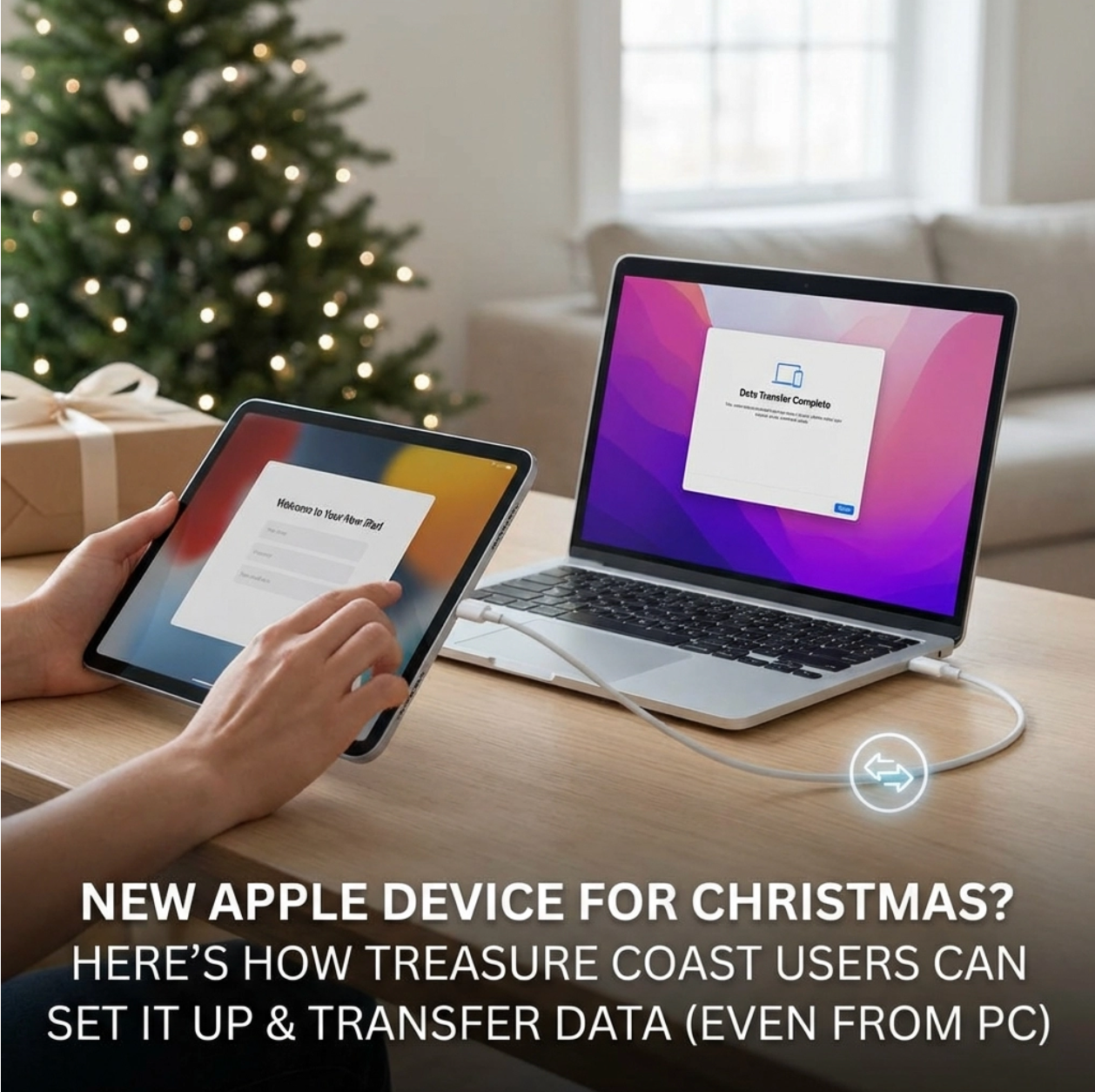 Christmas morning excitement just hit different this year, didn't it? That sleek Apple box under the tree had you practically bouncing off the walls. But now that the wrapping paper's cleared and reality sets in, you're staring at your shiny new iPhone, iPad, or Mac wondering: "Okay, now what?" If you're here on the Treasure Coast dealing with setup anxiety, take a deep breath. Whether you're upgrading from an ancient Android, switching from PC to Mac, or just need to move your digital life from one Apple device to another, we've got you covered. And hey, if tech isn't your thing, that's exactly why iService FL exists – but more on that later. Setting Up Your New iPhone: It's Easier Than You Think Your new iPhone is practically designed to set itself up these days. When you power it on for the first time, you'll see the "Hello" screen in multiple languages – that's your cue that you're in good hands. Quick Start is Your Best Friend Here's the magic trick Apple doesn't advertise enough: if you have another iPhone or iPad lying around, bring it close to your new device. Like, really close – within a few inches. Your old device will detect the new one and offer to help with setup. It's called Quick Start, and it's basically like having a tech-savvy friend do all the heavy lifting. This feature automatically transfers your Apple ID, Wi-Fi passwords, settings, and even your payment information. The whole process takes about 10-15 minutes, and you'll feel like you just performed actual wizardry. Starting Fresh? No Problem If you're coming from Android or this is your first iPhone, you'll manually enter your Apple ID (or create one) and connect to Wi-Fi. Pro tip from our Treasure Coast experience: your home Wi-Fi password is usually printed on your router's label. Save yourself the frustration and grab it before you start. The First Day Essentials Once you're past the initial setup, resist the urge to download every app immediately. Start with the basics: Messages, Phone, Mail, and maybe a few favorites. Your iPhone will perform better if you let it finish all the behind-the-scenes syncing first. iPad Setup: Your Digital Canvas Awaits iPad setup follows the same Quick Start process, but there are a few Treasure Coast-specific considerations. If you're planning to use your iPad for work (maybe you're running a business here in Stuart or Fort Pierce), think about your setup differently than if it's purely for entertainment. Choosing the Right Apple ID This might sound obvious, but use the same Apple ID across all your devices. We've seen too many local customers accidentally create multiple Apple IDs and then wonder why their photos aren't syncing. Keep it simple – one ID, all devices. Setting Up for Success During setup, you'll be asked about Apple Intelligence features (if you have a newer iPad). Say yes to these – they'll help with everything from text suggestions to photo organization. Just know they require an internet connection to work their magic. Mac Setup: The Big Kahuna Setting up a new Mac in 2026 is where things get interesting, especially if you're making the switch from Windows. The good news? Apple has made this process incredibly streamlined. "Set Up with iPhone" is a Game-Changer If you have an iPhone with iOS 25 or later, select "Set up with iPhone or iPad" during your Mac's Setup Assistant. Hold your unlocked iPhone near your Mac, and you'll see a swirling particle pattern appear on the Mac screen. Point your iPhone camera at this pattern, and watch your Wi-Fi settings, Apple ID, and preferences transfer automatically. It's honestly a little unsettling how well this works – in a good way. The Essential First Steps After your basic setup is complete, immediately update to the latest version of macOS. We're talking System Settings → General → Software Update. Don't skip this step – those early bug fixes are crucial. Next, enable FileVault encryption. This protects your data if your Mac is ever stolen or lost. It's under System Settings → Privacy & Security → FileVault. Yes, it takes a few hours to complete, but run it overnight and thank yourself later. Data Transfer from Old Apple Devices: Seamless Magic This is where Apple really shines. Moving from an old iPhone to a new one? From an aging MacBook to a shiny new MacBook Air? The process is designed to be almost foolproof. iPhone to iPhone: Quick Start Plus Beyond the initial Quick Start setup, your new iPhone will offer to restore from an iCloud backup or transfer directly from your old iPhone. Direct transfer is faster if both phones are connected to the same Wi-Fi network and plugged into power. Mac to Mac: Migration Assistant Magic For Mac-to-Mac transfers, Migration Assistant is your go-to tool. You can find it in Applications → Utilities. Connect both Macs to the same network (or use a Thunderbolt cable for speed), and Migration Assistant will walk you through transferring everything – applications, files, user accounts, the works. The process can take several hours depending on how much data you have, so plan accordingly. Maybe start it before bed or while you're at work. The PC to Mac Journey: We've Got Your Back Here's where things get a bit more complex, and honestly, where a lot of Treasure Coast residents decide to call in the professionals. But if you're feeling adventurous, here's what you need to know. What Transfers (and What Doesn't) Migration Assistant on Mac can connect to your Windows PC and transfer documents, photos, music, and email. What it can't transfer are your Windows applications – those you'll need to replace with Mac equivalents or find new solutions. Your Office documents will transfer fine, but you'll need to install Microsoft Office for Mac or use Apple's built-in alternatives like Pages, Numbers, and Keynote. The Reality Check PC to Mac migration isn't as seamless as Apple-to-Apple transfers. Expect to spend some time reconfiguring email accounts, finding new softw